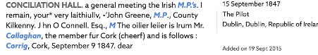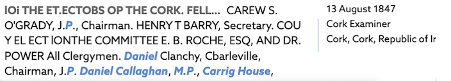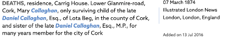 A distinction must be drawn between the Lotabeg estate and the wider Lotabeg townlands. During the eighteenth and nineteenth centuries, portions of the Lotabeg estate lands were sold, and the name “Lotabeg” came to be used more broadly to describe surrounding townlands. As a result, references to individuals being “of Lotabeg” or “living at Lotabeg” do not necessarily indicate residence at Lotabeg House itself. For Example: Contemporary records relating to Daniel Callaghan MP (1786-1849) describe his residence as Carrig House, situated within the Lotabeg townlands.
